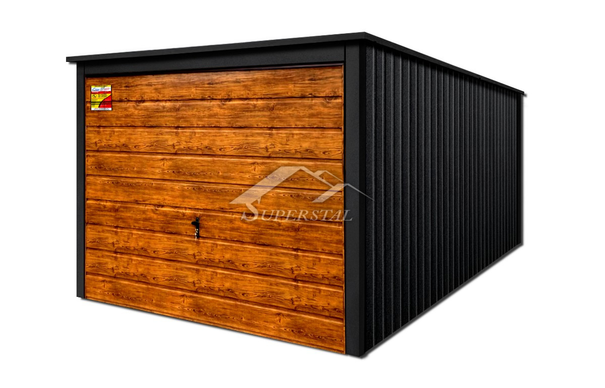 GARÁŽ LUX 3×4 – SPÁD STRECHY DOZADU, VÝKLOPNÁ BRÁNA V DEKORE DREVA, KOVANIE OKOLO STRECHY A ROHOVAk hľadáte moderný dizajn a dôraz na najmenšie detaily, nenašli by ste lepšiu ponuku! Ponúkaným produktom je inovatívna plechová garáž zo série LUX s rozmermi 3×4.