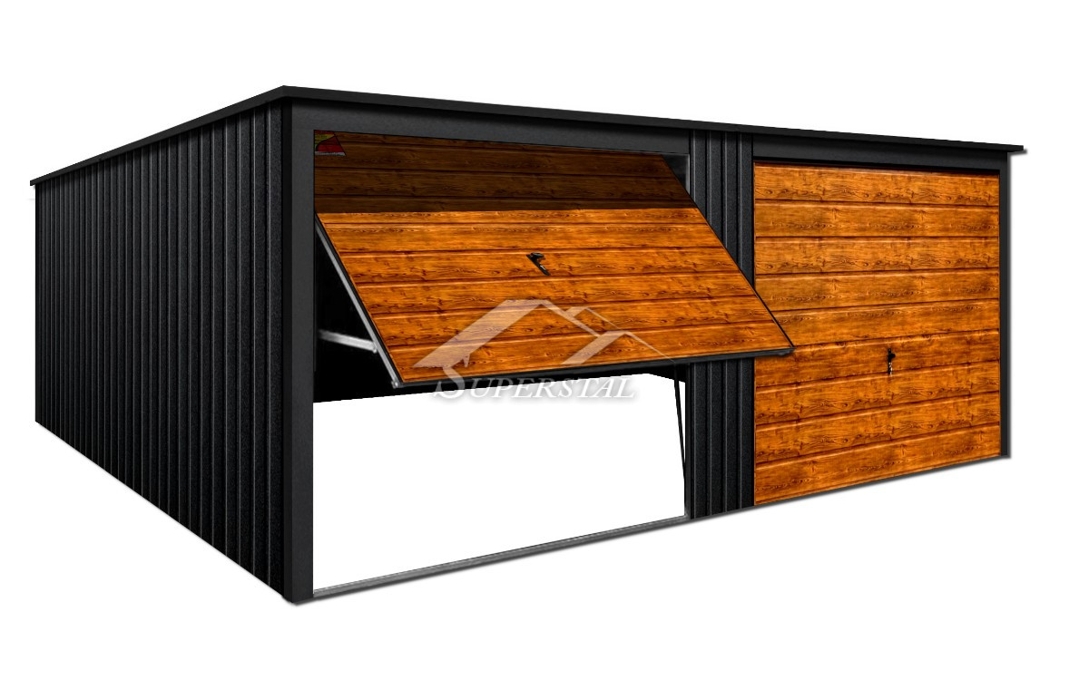 GARÁŽ LUX 8×5 – SPÁD STRECHY DOZADU, VÝKLOPNÉ BRÁNY V DEKORE DREVA, KOVANIE OKOLO STRECHY A ROHOVAk hľadáte moderný dizajn a dôraz na najmenšie detaily, nenašli by ste lepšiu ponuku! Ponúkaným produktom je inovatívna plechová garáž zo série LUX s rozmermi 8×5.