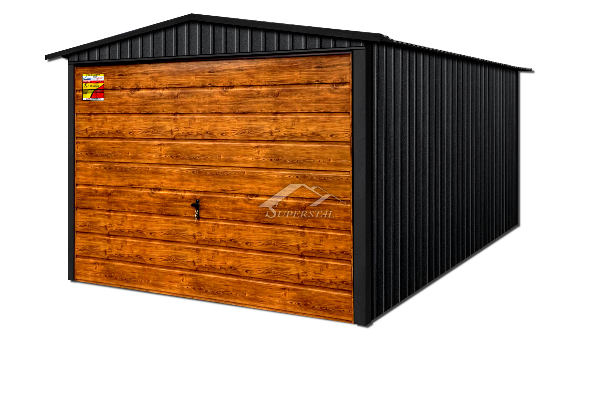 GARÁŽ LUX 2X4 – SEDLOVÁ STRECHA, VÝKLOPNÁ BRÁNA V DEKORE DREVA, KOVANIE OKOLO STRECHY A ROHOV