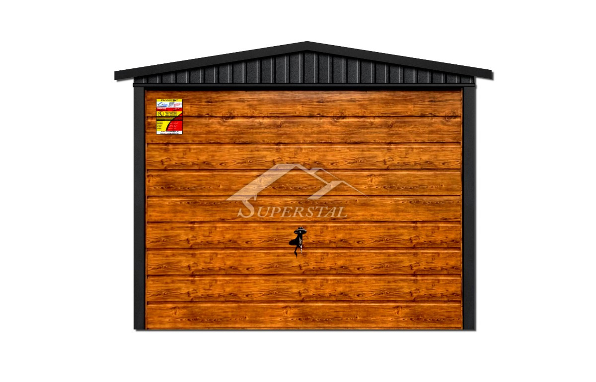 GARÁŽ LUX 3×9 – SEDLOVÁ STRECHA, VÝKLOPNÁ BRÁNA V DEKORE DREVA, KOVANIE OKOLO STRECHY A ROHOVAk hľadáte moderný dizajn a dôraz na najmenšie detaily, nenašli by ste lepšiu ponuku! Ponúkaným produktom je inovatívna plechová garáž zo série LUX s rozmermi 3×9.