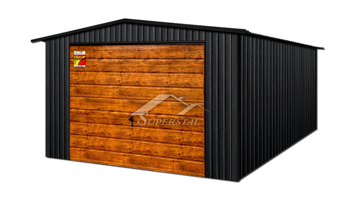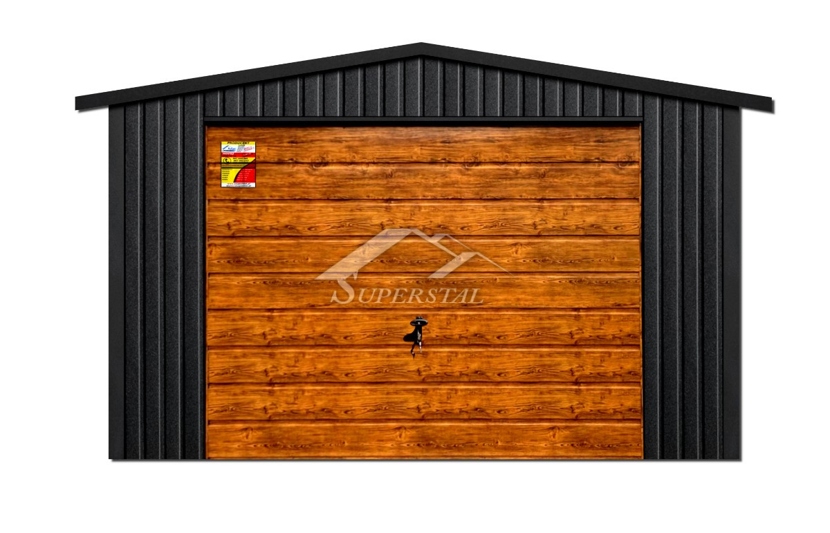 GARÁŽ LUX 4×5 – SEDLOVÁ STRECHA, VÝKLOPNÁ BRÁNA V DEKORE DREVA, KOVANIE OKOLO STRECHY A ROHOVAk hľadáte moderný dizajn a dôraz na najmenšie detaily, nenašli by ste lepšiu ponuku! Ponúkaným produktom je inovatívna plechová garáž zo série LUX s rozmermi 4×5.
