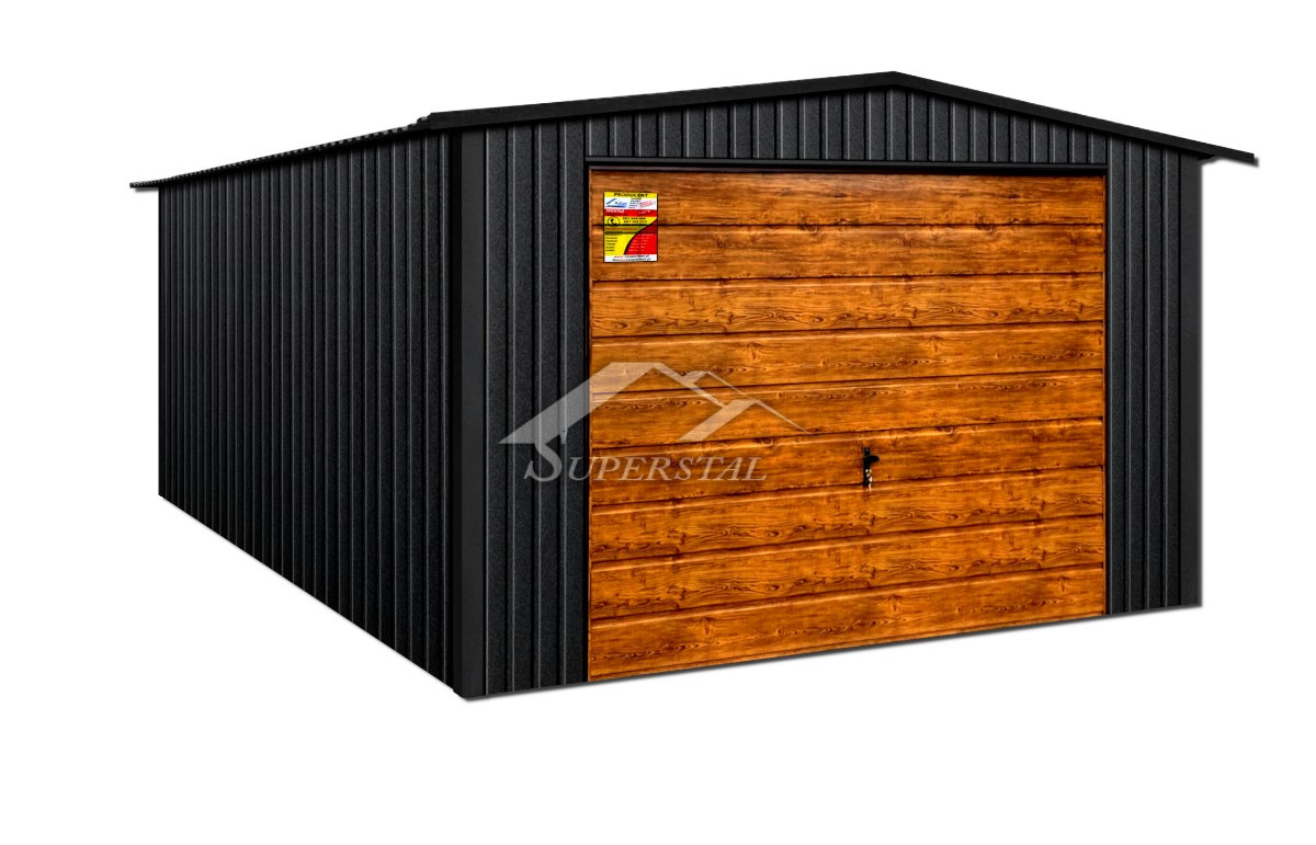 GARÁŽ LUX 5×5 – SEDLOVÁ STRECHA, VÝKLOPNÁ BRÁNA V DEKORE DREVA, KOVANIE OKOLO STRECHY A ROHOVAk hľadáte moderný dizajn a dôraz na najmenšie detaily, nenašli by ste lepšiu ponuku! Ponúkaným produktom je inovatívna plechová garáž zo série LUX s rozmermi 5×5.