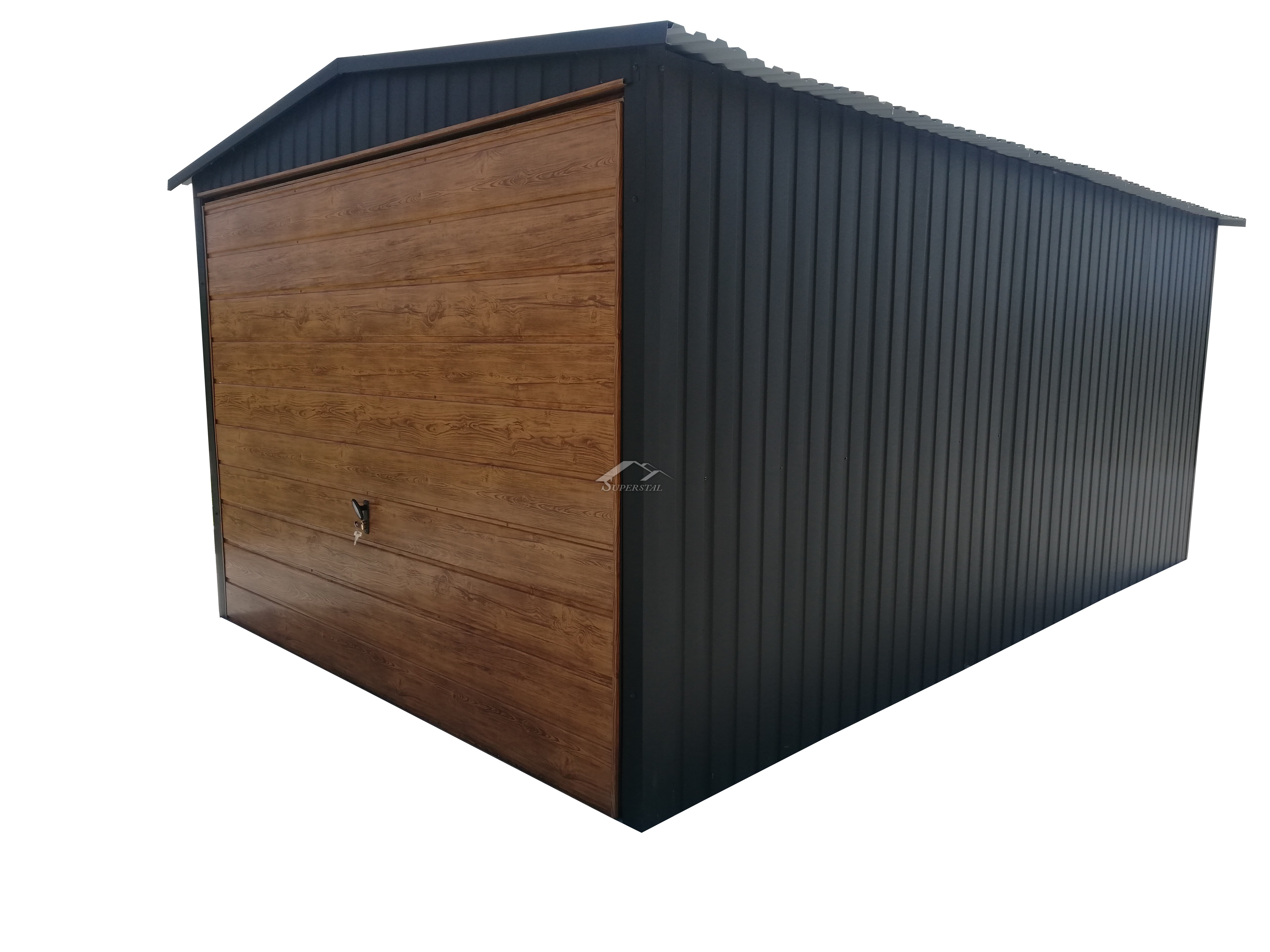ŘADA LUX:Plechová garáž 3x5, sedlová střecha, černá matná, s výklopnými dveřmi v barvě borovice v širokém horizontálním panelu.