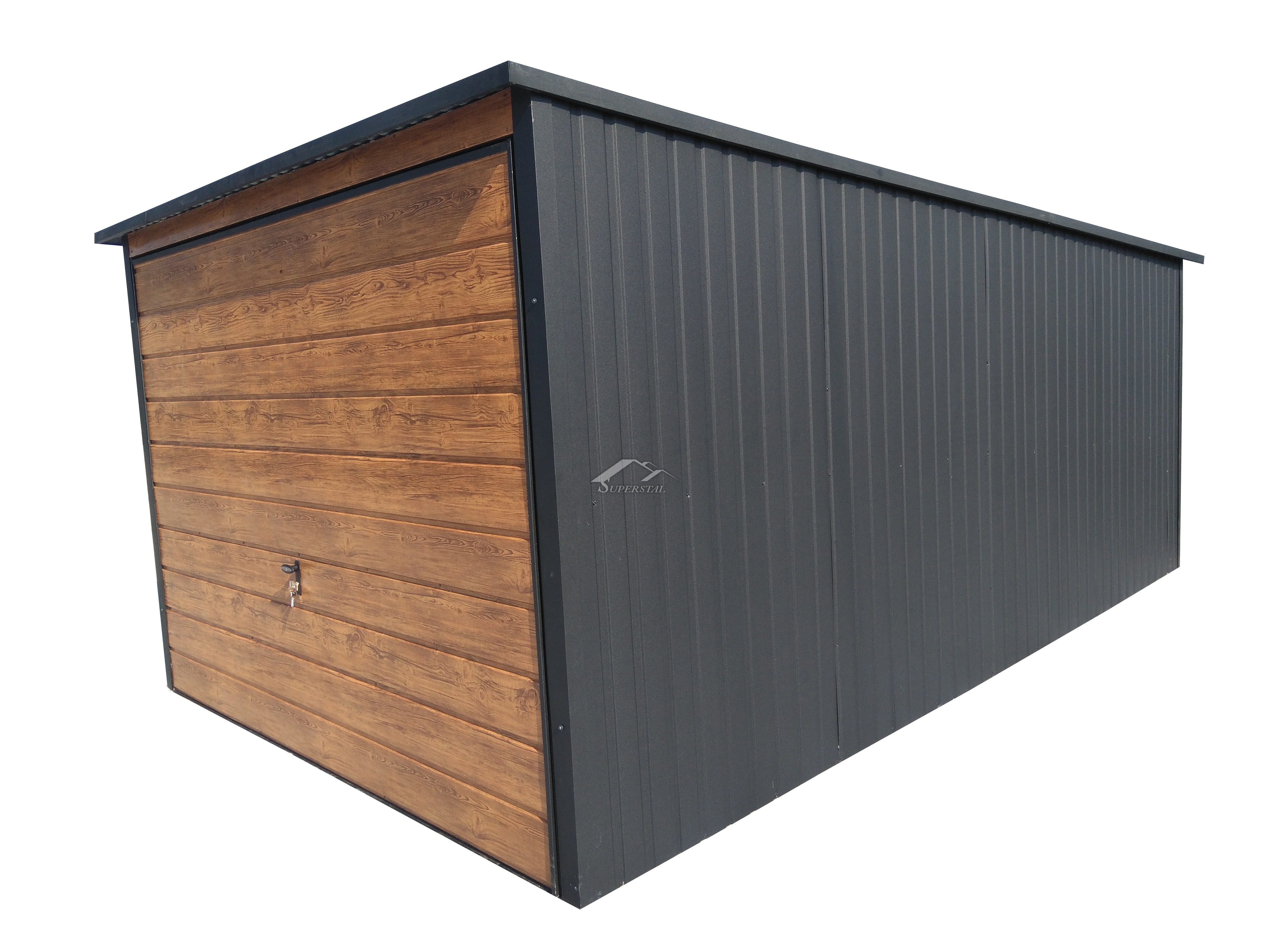 Plechová garáž 3x6 sklon střechy dozadu, v matné černé barvě s borovicovou výklopnou bránou se širokým horizontálním panelem