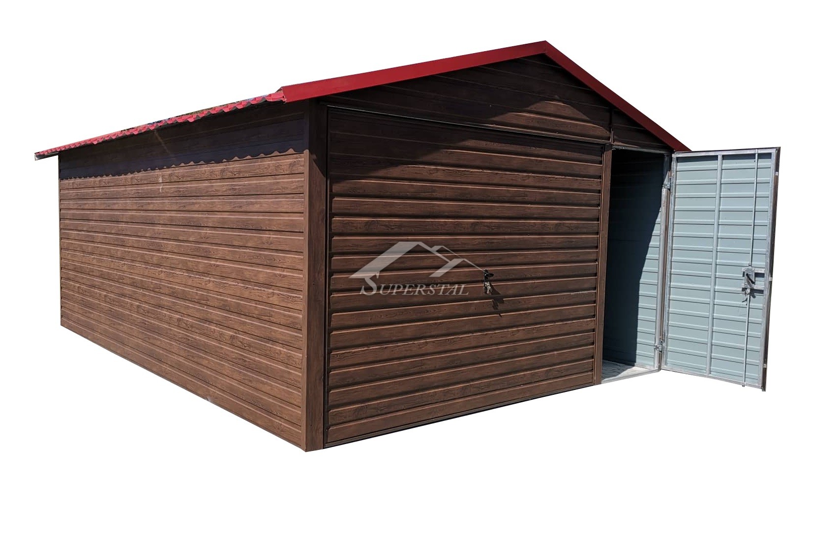 Garáž v provedení ořechu působí velmi esteticky. Zesílená konstrukce a ocelový plech pokrytý barvou vám umožní užívat si vzhled a funkčnost garáže po mnoho let.