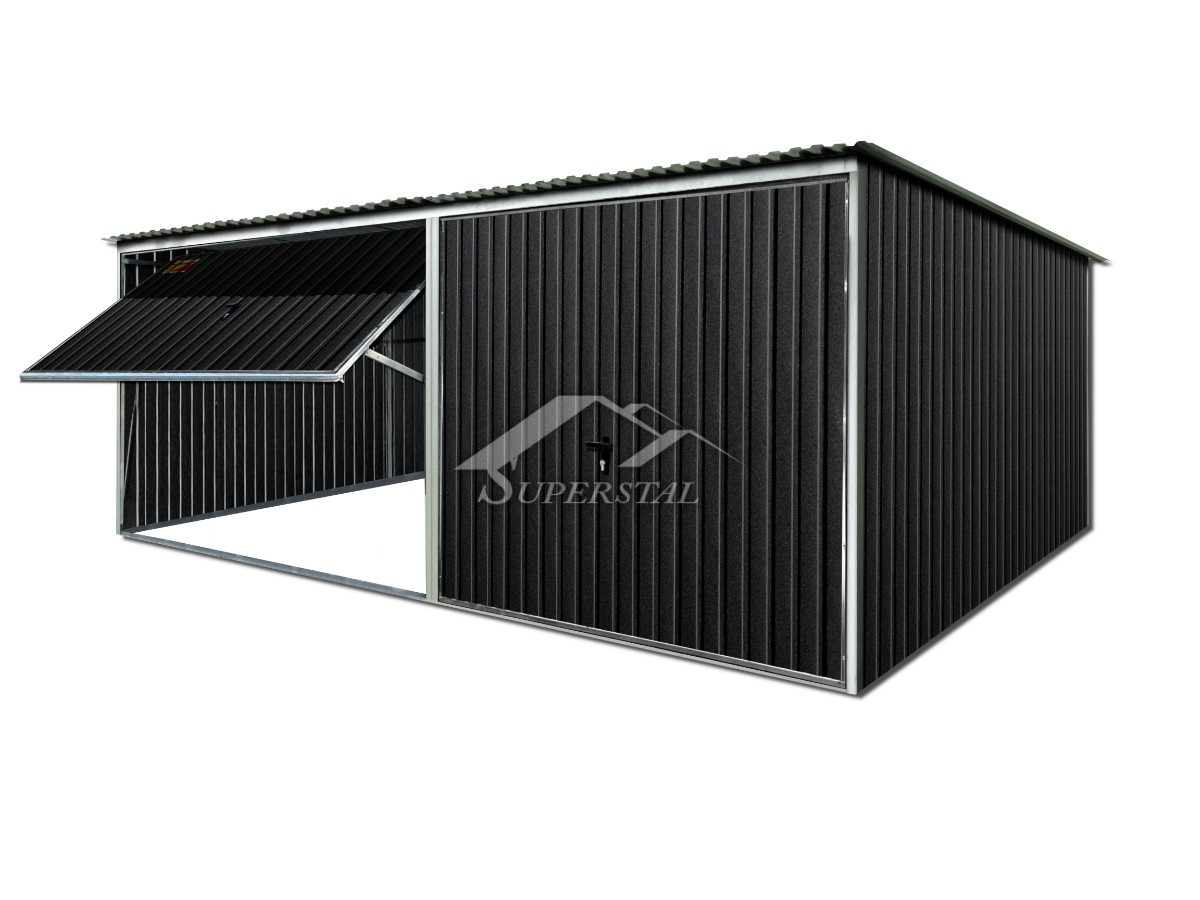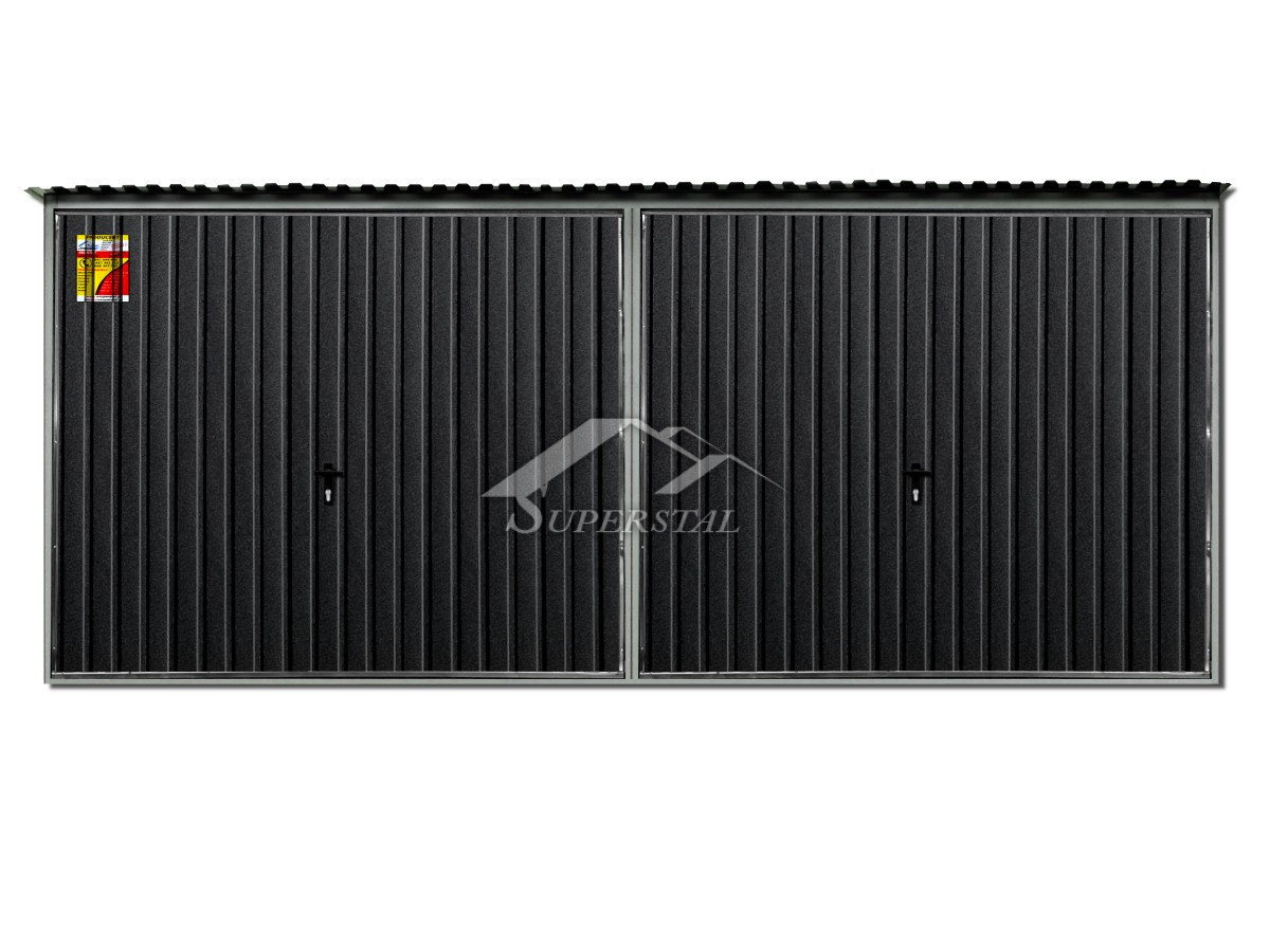 GRAFITOVÁ FAREBNÁ PLECHOVÁ GARÁŽ 6X6 – SPÁD STRECHY DOZADU, VÝKLOPNÉ BRÁNY
