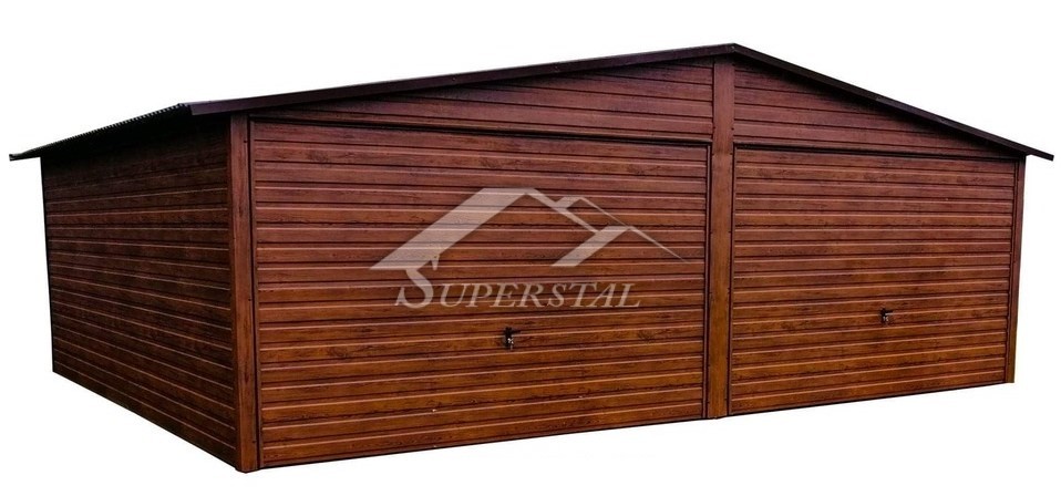 Garáž v barvě ořechu s kováním působí velmi esteticky. Jedná se o velmi funkční konstrukci díky použití křídlové brány v plechové garáži.